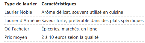 Dans le monde culinaire, vous aurez principalement accès à deux types de laurier : le laurier noble et le laurier d'Arménie. Le laurier noble est le plus couramment utilisé et se distingue par son arôme délicat, souvent recherché dans les préparations culinaires. À l'inverse, le laurier d'Arménie présente une saveur plus forte et résineuse, ce qui peut ne pas convenir à toutes les recettes.