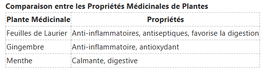 Il est fascinant de comparer les feuilles de laurier avec d'autres plantes médicinales souvent utilisées. Leurs propriétés anti-inflammatoires peuvent rivaliser avec celles du gingembre, tandis que leur capacité à favoriser la digestion les place sur le même plan que la menthe. Vous verrez que cette comparaison révèle non seulement les similitudes, mais aussi les spécificités de chaque plante.