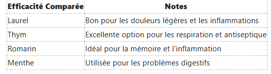 En étudiant ces comparaisons, il est important de noter que chaque plante possède un spectre d'usage spécifique qui peut varier d'une culture à l'autre. Vous découvrirez ainsi que les feuilles de laurier se démarquent non seulement par leur goût, mais aussi par leur large éventail d'applications thérapeutiques qui les rendent pertinentes à travers les âges.