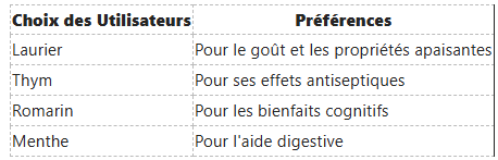 Les choix des utilisateurs en matière de remèdes naturels varient considérablement selon leurs préférences et leurs expériences personnelles. Nombreux d'entre vous privilégient les feuilles de laurier pour leur goût distinctif et leurs propriétés apaisantes. D'autres peuvent se tourner vers des alternatives comme le thym pour des besoins plus spécifiques, notamment anti-inflammatoires.