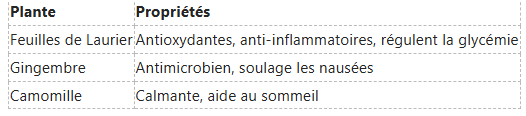 Lorsque l'on examine les différentes options de remèdes naturels disponibles, il est utile de comparer les feuilles de laurier avec d'autres plantes médicinales telles que le gingembre ou la camomille. Chacune de ces plantes possède des propriétés uniques que vous pouvez exploiter selon vos besoins particuliers. Voici un aperçu des distinctions entre ces remèdes.